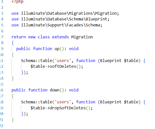 Secara default laravel sudah menyediakan tabel Users, jadi pada contoh ini hanya perlu menambahkan 1 kolom deleted_at pada tabel Users.