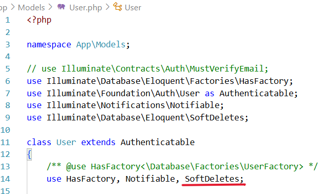 Cari dulu direktori model pada projek laravel kalian,  pada contoh ini terdapat pada app/Models/ , kemudian buka file User.php lalu tambahkan SoftDeletes pada use.
