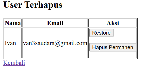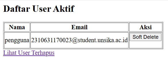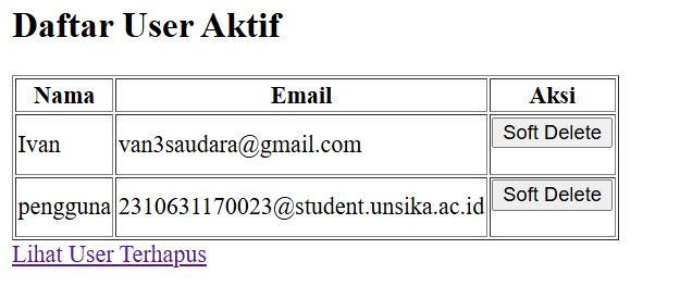 disini saya buat 2 file blade.php sederheana berbeda, 1 untuk lihat user aktif dan 1 untuk lihat user yang tersoft delete, user yang di soft delete nggak langsung hilang dari database, tapi cuma ditandai dengan kolom deleted_at. Dengan begitu, data masih bisa dipulihkan kapan saja lewat fitur restore, atau kalau benar-benar sudah nggak dipakai baru dihapus permanen.