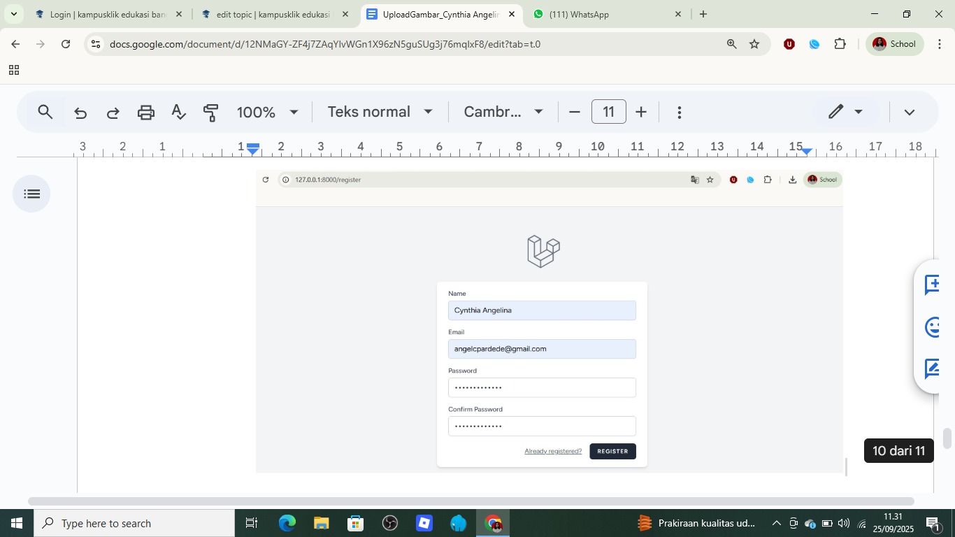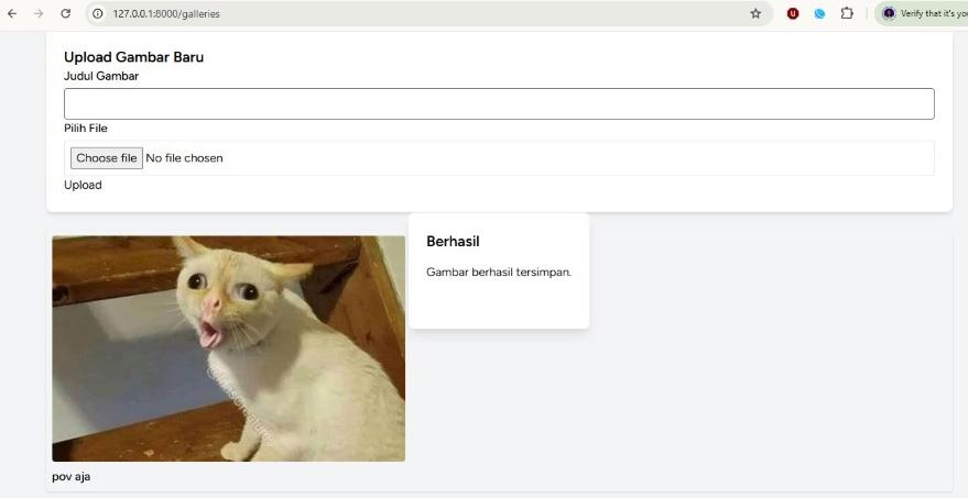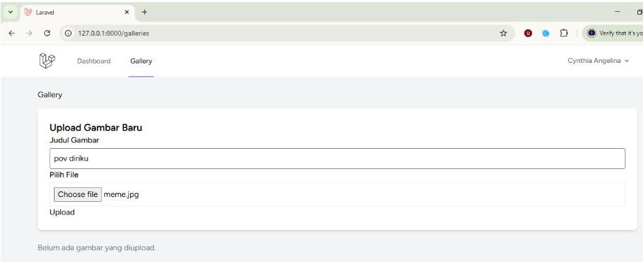 Dengan langkah-langkah di atas, saya berhasil membuat fitur Upload Gambar di Laravel. Proses dimulai dari membuat model dan migration, controller, routing, view, hingga menghubungkan storage ke public agar gambar dapat diakses. Hasil akhirnya berupa galeri gambar sederhana yang hanya bisa diakses oleh user yang sudah login.