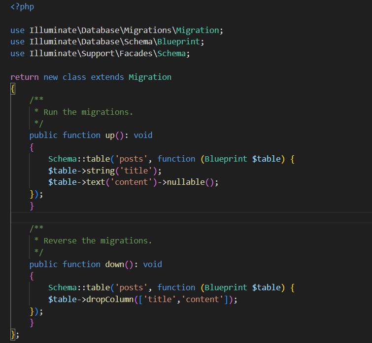 Edit file database/migrations/xxxx_add_title_and_content_to_posts_table.php:
