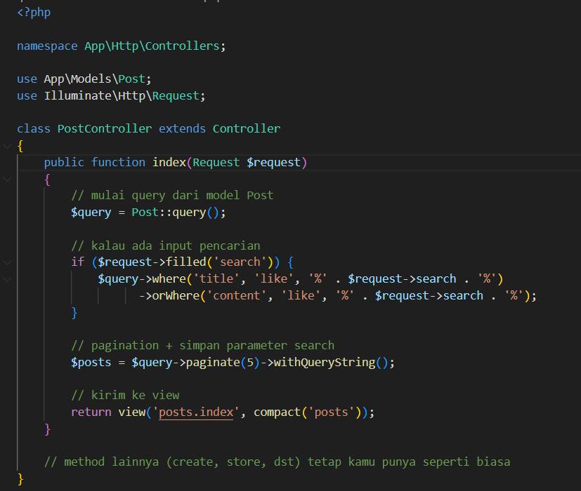Secara keseluruhan, implementasi ini berhasil memperlihatkan bagaimana Laravel memberikan dukungan bawaan untuk pagination sekaligus mempermudah developer dalam menambahkan fitur pencarian, sehingga aplikasi menjadi lebih efisien, rapi, dan nyaman digunakan.