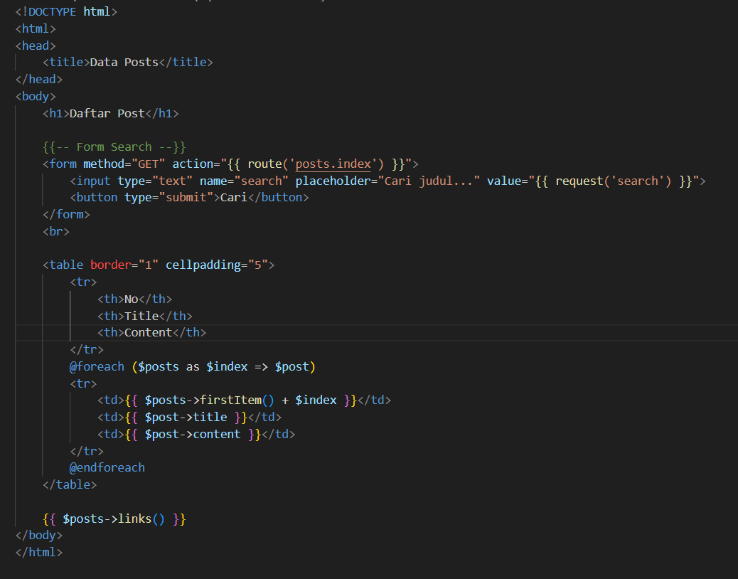 7). Membuat folder resources/views/posts/ lalu file index.blade.php: