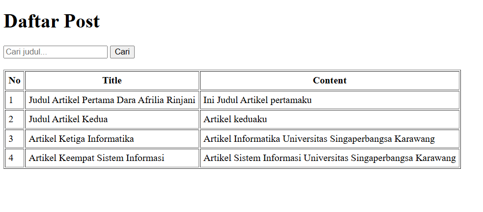 Data ditampilkan dalam bentuk tabel dengan kolom No, Title, dan Content, sehingga pengguna dapat melihat daftar posting dengan rapi.
