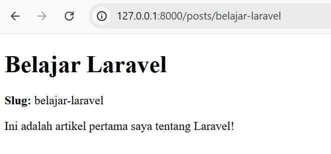 Untuk menguji project, server dijalankan menggunakan perintah php artisan serve. Perintah ini akan menampilkan alamat default yaitu http://127.0.0.1:8000 yang dapat diakses melalui browser. Ketika membuka URL http://127.0.0.1:8000/posts/belajar-laravel, Laravel otomatis mengambil data dari tabel posts berdasarkan slug belajar-laravel. Jika data ditemukan, maka hasilnya akan ditampilkan dalam bentuk JSON. Namun jika slug tidak sesuai atau tidak ada di database, Laravel akan menampilkan error 404 Not Found.