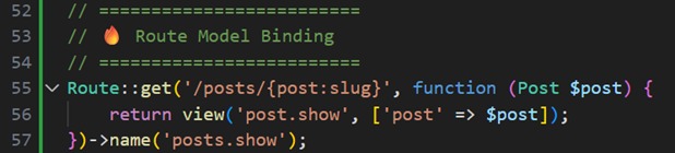 Tahap berikutnya adalah menambahkan route pada file routes/web.php dengan parameter {post}. Berkat Route Model Binding, Laravel otomatis akan mencocokkan parameter URL dengan data yang ada di database berdasarkan slug. Dengan begitu, kita tidak perlu lagi menulis query manual seperti Post::where('slug', ...).